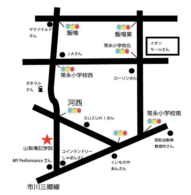 国母交差点を昭和バイパス方面へ進んでください。 イオンモールさんの南、不動産かたやまさんの所で左折します。イオンモールさんの西側の道路を南側に向かって直進している状態になります。 右手にローソンさんがある信号交差点(常永小学校北)、を右折します。西側に向かいまっすぐ進むと左手にシューマートさんが見えてきます。 その先の交差点(常永小学校南)を左折してください。(コメダ珈琲さんや松屋さんや見えたら行きすぎです。) 左折後、細い道をまっすぐ進みます。途中で道なりに一度左にカーブしますが、すぐに右カーブで南方向に戻ります。その一つ目の信号(河西)を直進すると、すぐ右側にあります。 右上方に、山梨資格学院の看板があります。右上方に黄色い「みよし」さんと赤い「鶴」さんの看板が見えたら、またはMYperformanceさんまでいったらすこし行きすぎです。